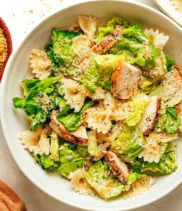 I use grilled chicken, romaine lettuce, parmesan cheese, and Caesar dressing.