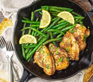 I cook chicken with lemon juice, garlic, and herbs, then serve it with sautéed or steamed green beans.