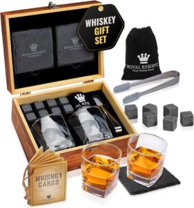 A whiskey stones and glass set adds a touch of luxury to his evenings.