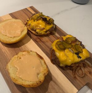 I spread the homemade sauce on the bottom bun, added the cheesy smash patty with onions, and topped it with the other half of the bun.