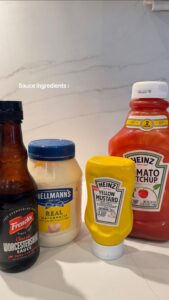 I added mayonnaise, ketchup, yellow mustard, and a few drops of Worcestershire sauce.